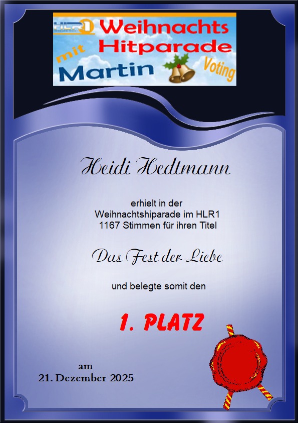 Urkunde für Platz 1 in der Weihnachtshitparade von Radio HLR1 mit dem Titel "Das Fest der Liebe"